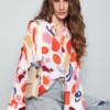 Women’s blue abstract print shirt designed with full sleeves and a classic front button closure. Perfect to style it with beige pants or trousers and strappy heels.